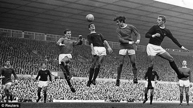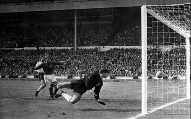 George Best airborne, scoring the second of his three goals against West Ham United at Old Trafford 1971