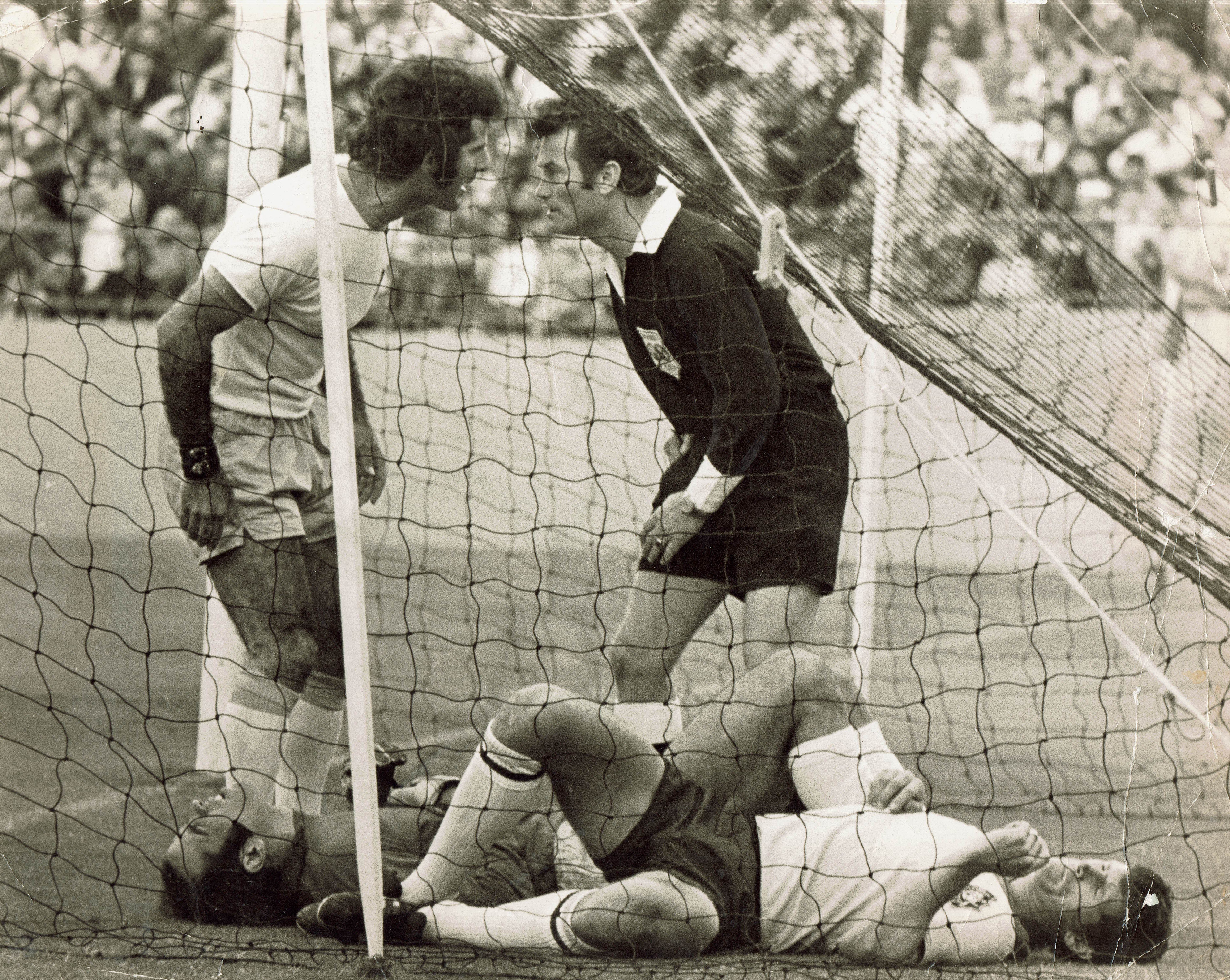 South Coast United international striker Max Tolson spreadeagled after a clash with the Israeli goalkeeper in 1969. Referee Tony Boskovic reading the riot act.
