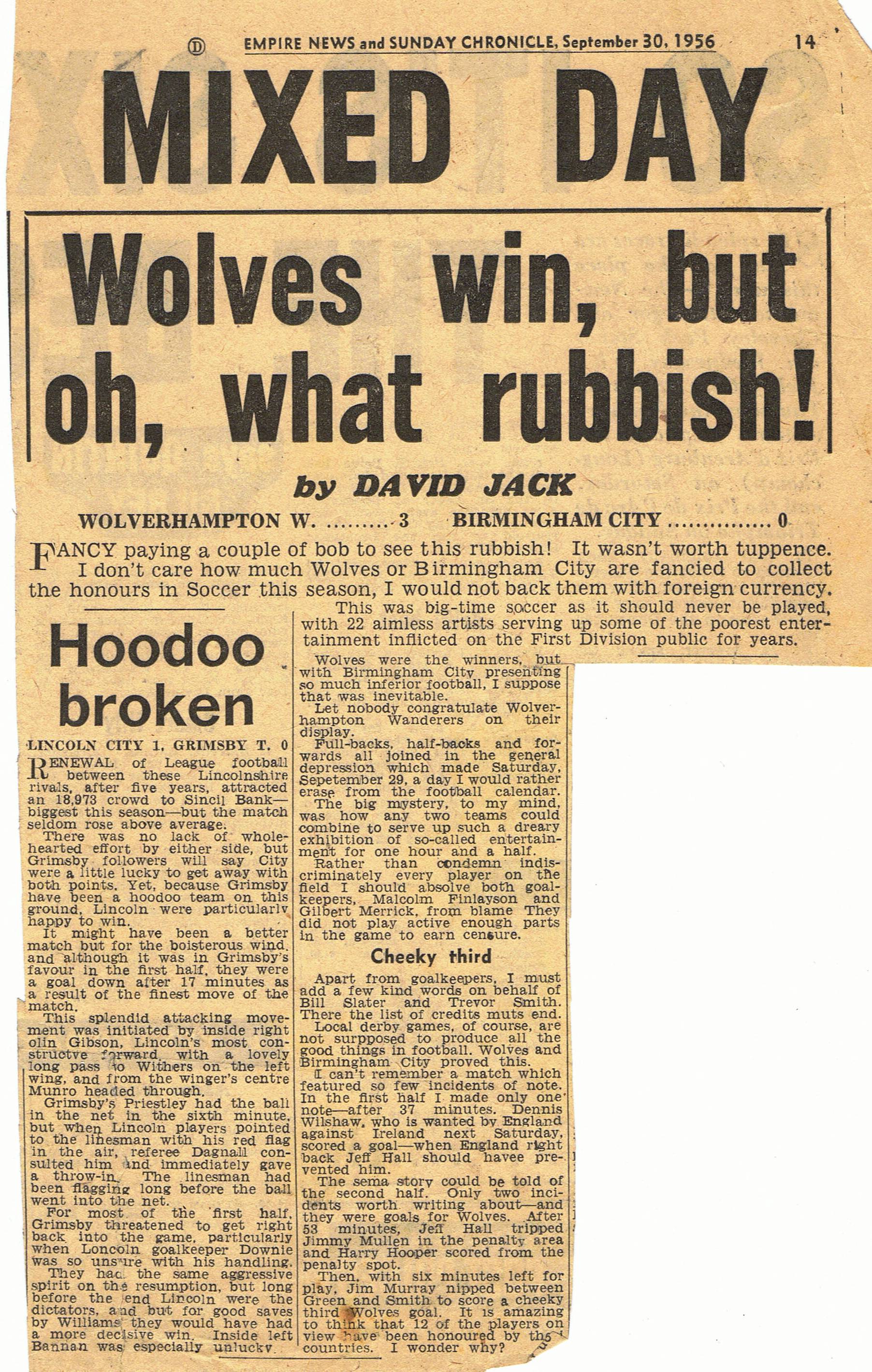 Nearly ten years into his journalism career, David was a reputable and respected football writer. In 1956 however, his reputation risked coming unstuck, the result of a damning but what he considered, honest report of a First Division match between Wolverhampton Wanderers and Birmingham City. Both clubs were unhappy with the report and consequently banned David from press box and directors box facilities at their respective grounds.