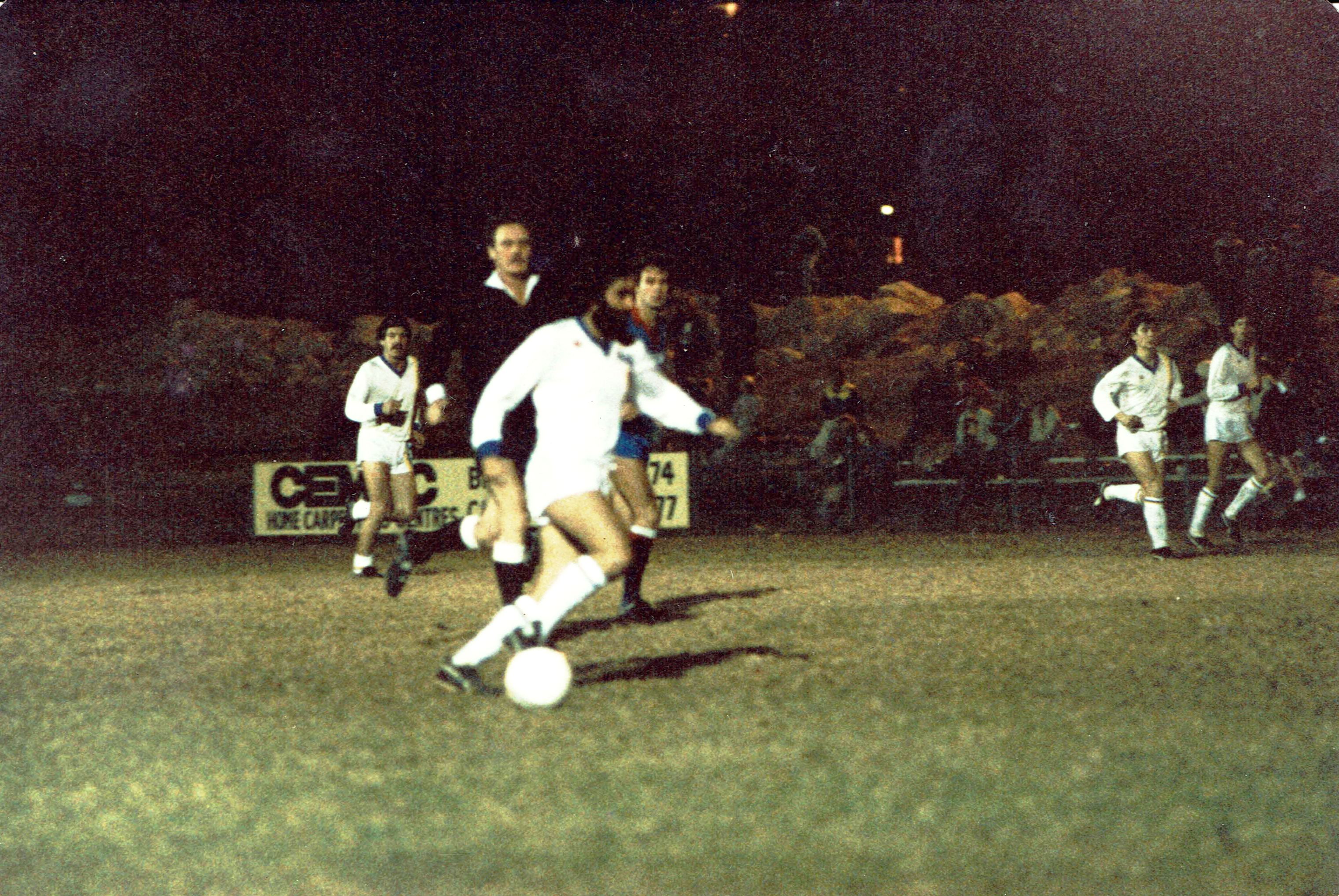 George Best playing for Dee Why against Manly in 1983 – I’m in the blue strip of Manly, shadowing George