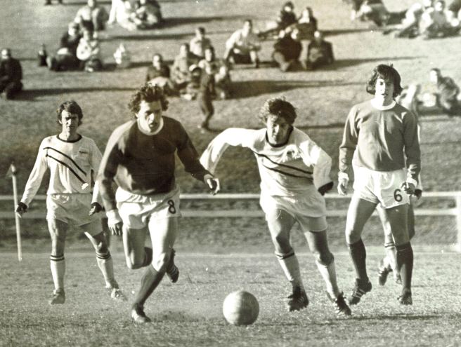 Socceroos Attila Abonyi and Alan Ainslie (dark shirts) playing at suburban Drummoyne Oval Sydney in 1971 : Photo – Anton Cermak Col Curran (dark shorts) who gave up the chance of overseas professional football to forge a very successful career in Australia : Photo – Anton Cermak