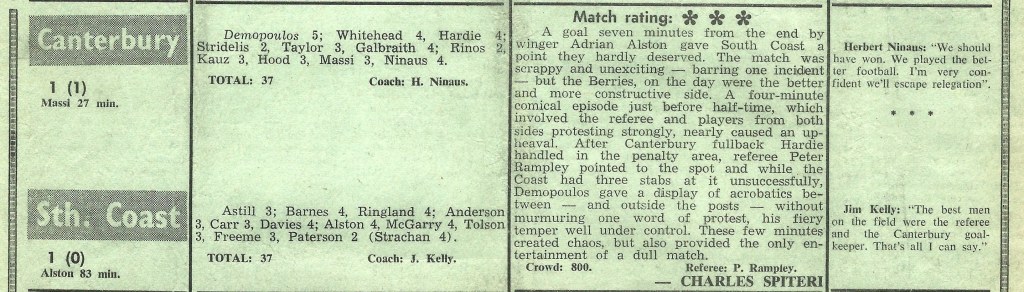 Reporter Charles Spiteri was not impressed and despite an Adrian Alston goal 7 minutes from time, Canterbury held on for a valuable point. Spiteri did however enjoy an impromptu comedic episode that resulted from a penalty kick being taken three times. Arlington Oval, like so many similarly named grounds, was not an oval but a quadrangle with peculiarly angled touchlines. It was also distinct because of a brick wall behind one goal that ran the width of the pitch and the remnants of a small fibro dwelling, masquerading as dressing rooms. Like the brick wall, another permanent fixture at Arlington Oval was club stalwart Andy Burton, who was always willing to share a half time nip of scotch to curry favour from supportive journalists.