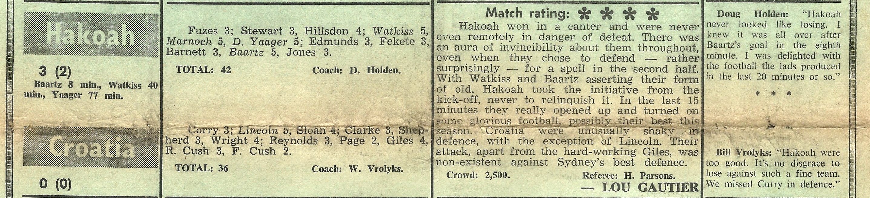 Lou Gautier appeared to enjoy the encounter, reporting that Hakoah, “turned on some glorious football”. That Marnoch, Watkiss, Yaager and Baartz all recorded “5” in the player ratings emphasises the quality of this Hakoah team. The crowd was noted as a neat 2,500 and could well have been just a Frank Lowy estimate as the club president looked out from his “corporate box” above the Wentworth Park dressing rooms.