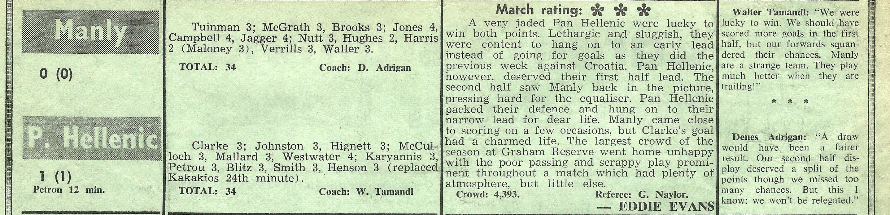 Next up, Manly against Pan Hellenic at LM Graham Reserve. I was at that game as a spectator, playing at the time in the Manly under 15 representative side. A bumper crowd of 4,393 attended, Manly’s highest of the season as rumours spread that Takis Loukanidis would make his debut for Pan Hellenic. Loukanidis was at the ground but didn’t pull on his boots, preferring to be a spectator, mixing amiably with the adoring Greek fans. Pan Hellenic took an early lead and although Manly became more threatening in the second half, Hellenic did enough to take both points.