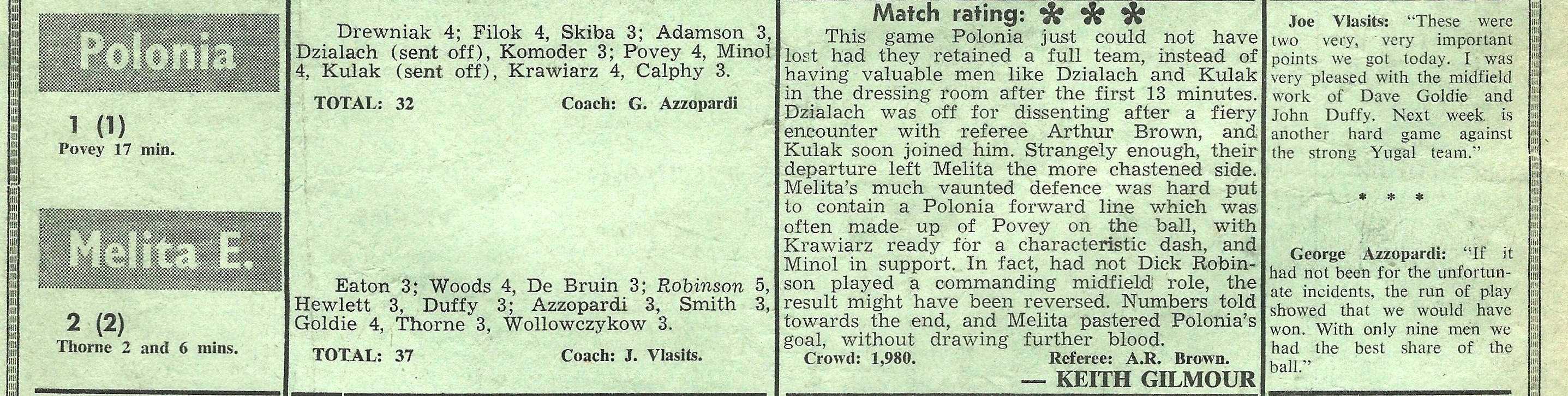 Polonia had two players sent off in the first thirteen minutes which killed off their hopes of victory and it is surprising that Kas Kulak was one of the players sent off. I got to know Kas quite well when he coached at Western Suburbs and my memory of Kas was that he was a very polite man, liked to dress well and was partial to sweet smelling after shave lotion. Former Ipswich Town and Notts County striker, Terry Thorne scored both goals early on for Melita with Melita’s goalkeeper Terry (“The Eagle”) Eaton, being called upon infrequently to handle the best efforts of the nine man Polonia side. For Melita, Wollowczykow appears to have mistaken the Polonia home team dressing room for that of the away team. Later that year, I made my grade debut at North Sydney Oval and I clearly remember that the away dressing room was the one with the cold showers !