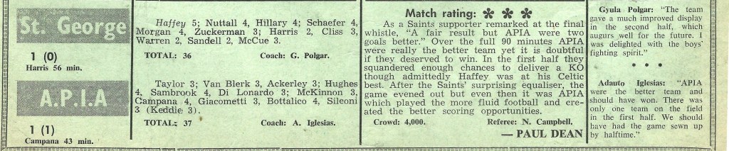 Hurstville Oval hosted the final match of the round between St. George and APIA Leichhardt. Both teams had a plethora of international or future international players and APIA took the lead through their skilful Argentinian, Ricardo Campana, just before half time. St. George equalised courtesy of a 19 year old George Harris and Soccer World’s Paul Dean remarked that APIA were “really the better team yet it is doubtful if they deserved to win”. The Soccer World editor also added that for St. George, goalkeeper Frank Haffey “was at his Celtic best” though APIA would have preferred that he reprise his Scotland form of 1963 when the affable Scotsman let England score 9 goals against him. It was reported that bang on 4,000 attended the match, which again is an indicator that nobody could really be bothered counting the cash in 1968 !